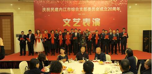 为热烈庆祝民建内江市综合支部委员会成立20周年、民建内江市综合支部和民建乐山市创业总支建立友好合作关系以及民建内江市综合支部胜利召开第五届换届会员大会三项主题活动。2017年1月6日下午5时,民建内江市综合支部在我市飘香园会议中心牡丹厅隆重举行“不忘初心、砥砺前行”主题文艺表演。民建内江市委主委、市政协副主席徐进才,民建乐山市委副主委兼秘书长刘梅,民建内江市委副主委、市中区政府副区长刘澜,民建内江市委副主委兼综合支部主委官忠全,民建内江市委秘书长李梅,民建乐山市创业总支主委、乐山市犍为县人民政府副县长金漫等领导出席活动,民建内江市委委员及专委会负责人、民建乐山市创业总支会员、民建内江市综合支部会员及家属等100余人一起观看表演,共同见证民建内江市综合支部的成长和发展。